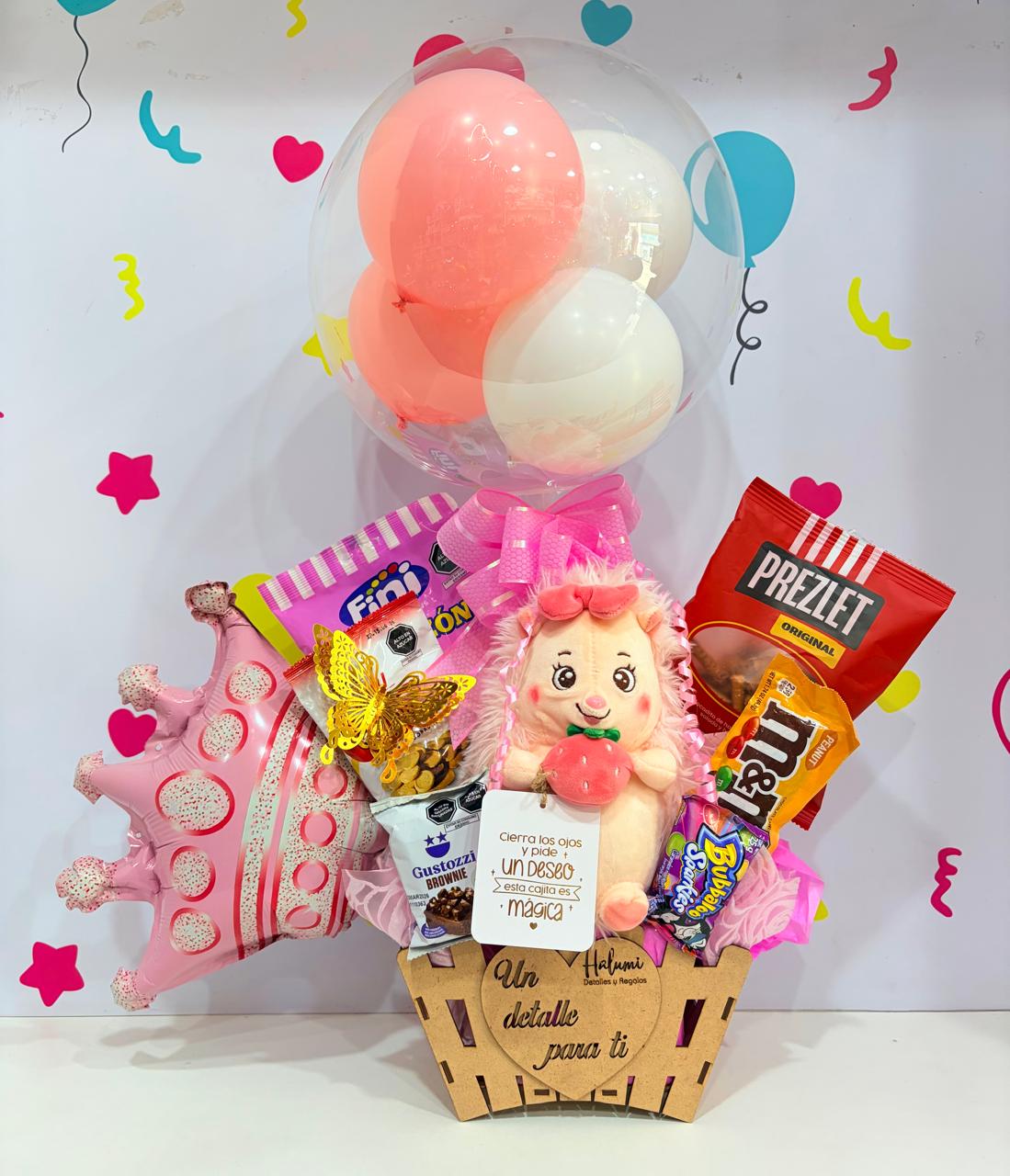 1 peluche + 1 globo burbuja + 1 globo corona + dulces varios