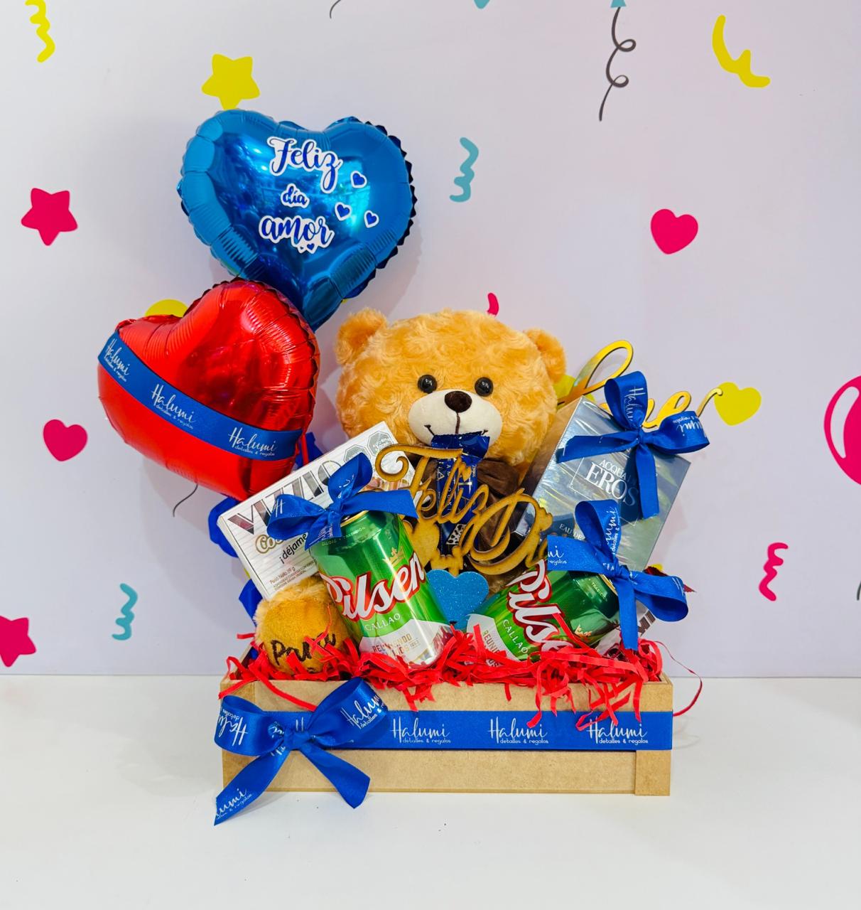Peluche + globos + caja de chocolate + cerveza +1 perfume