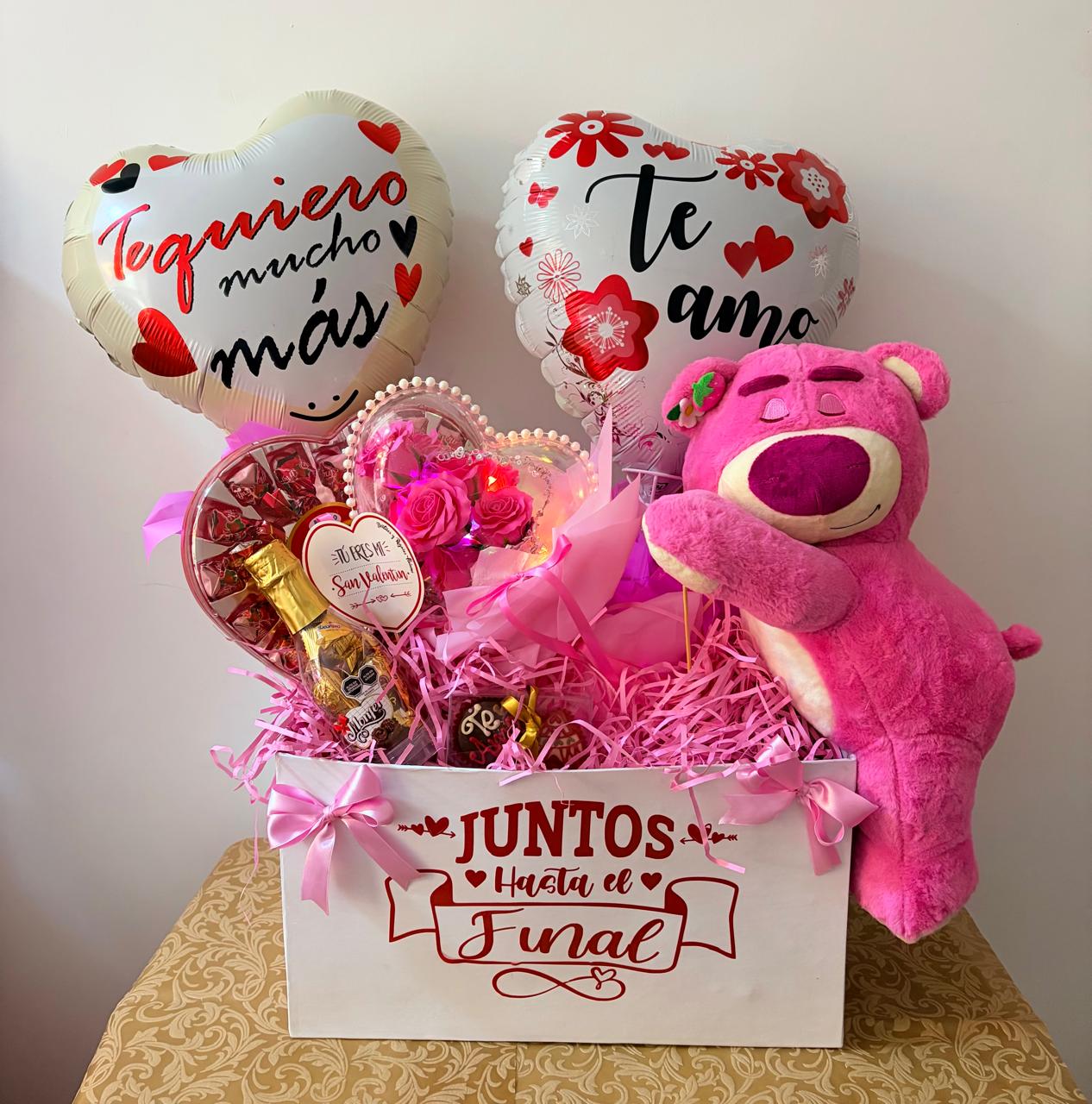1 peluche grande + globos grandes + adorno de flores artificiales + chocolates