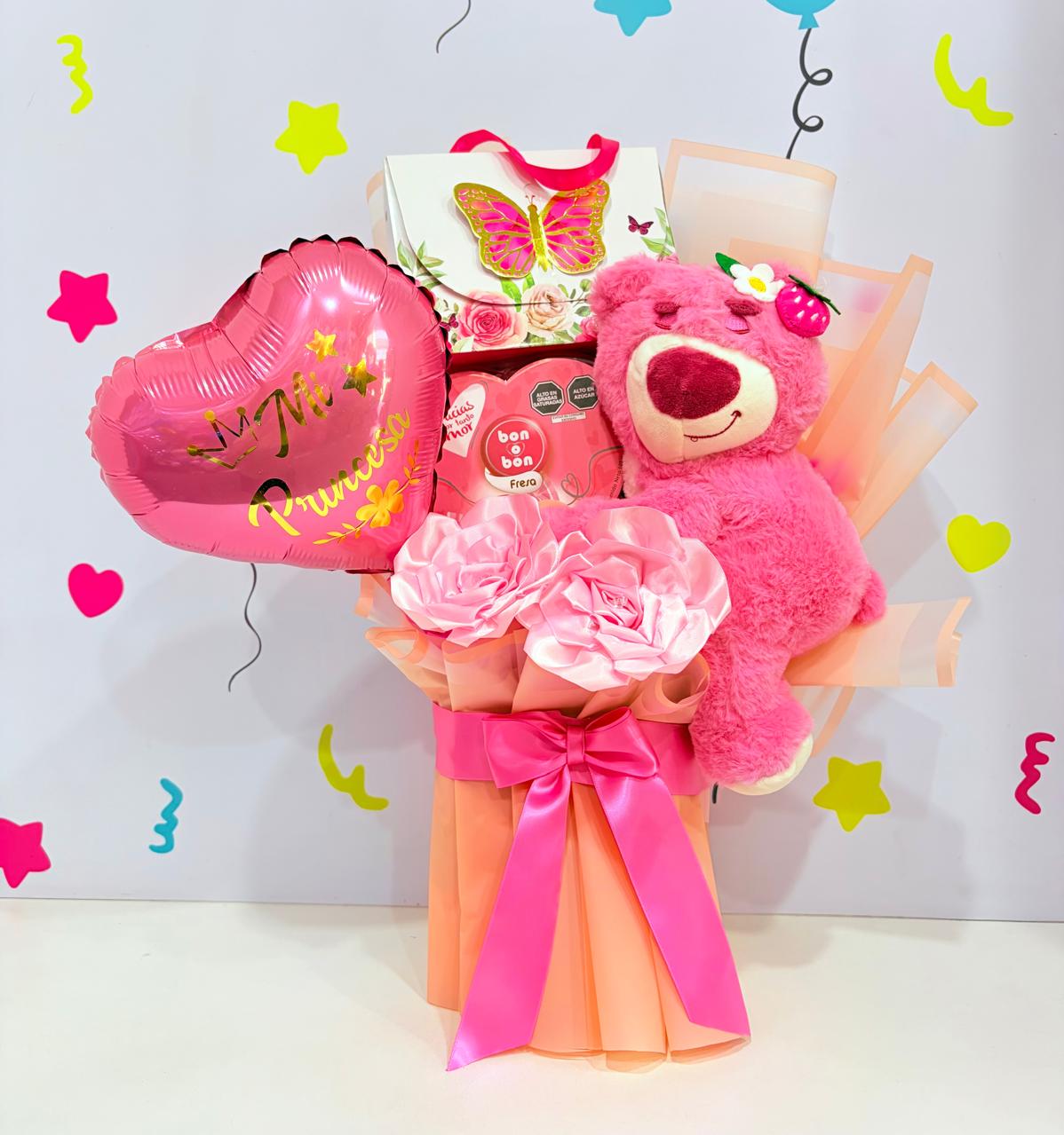 1 peluche + 1 globo con frase + flores artificiales + cajas de chocolates