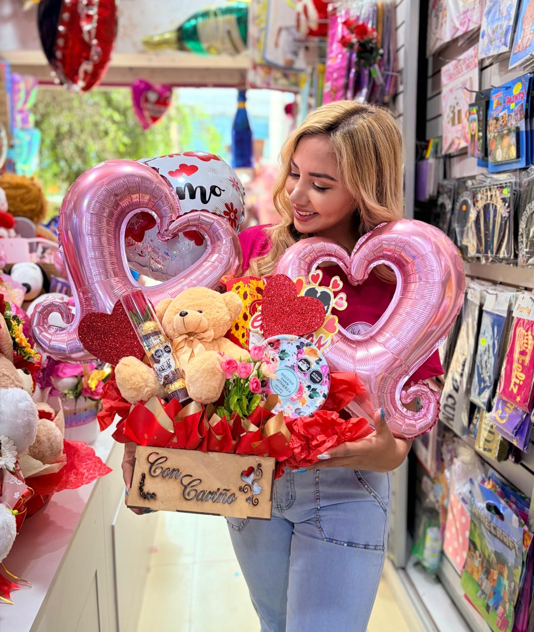 Flores artificiales + peluche + globos + chocolate