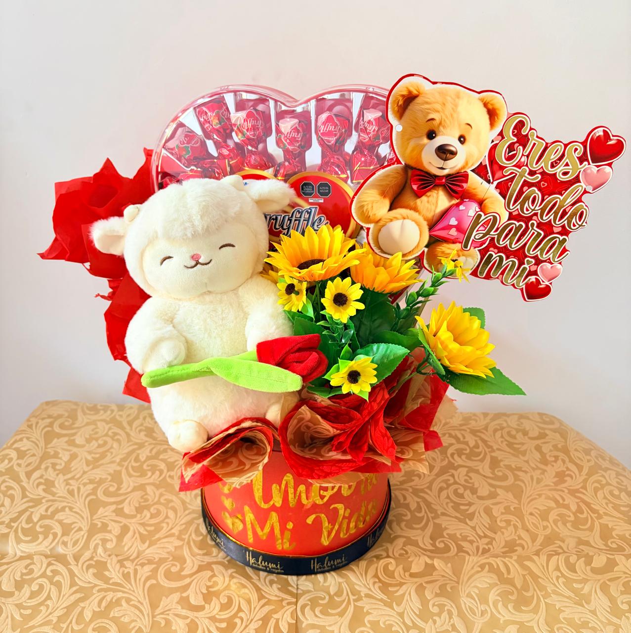 Peluche + flores artificiales + chocolate
