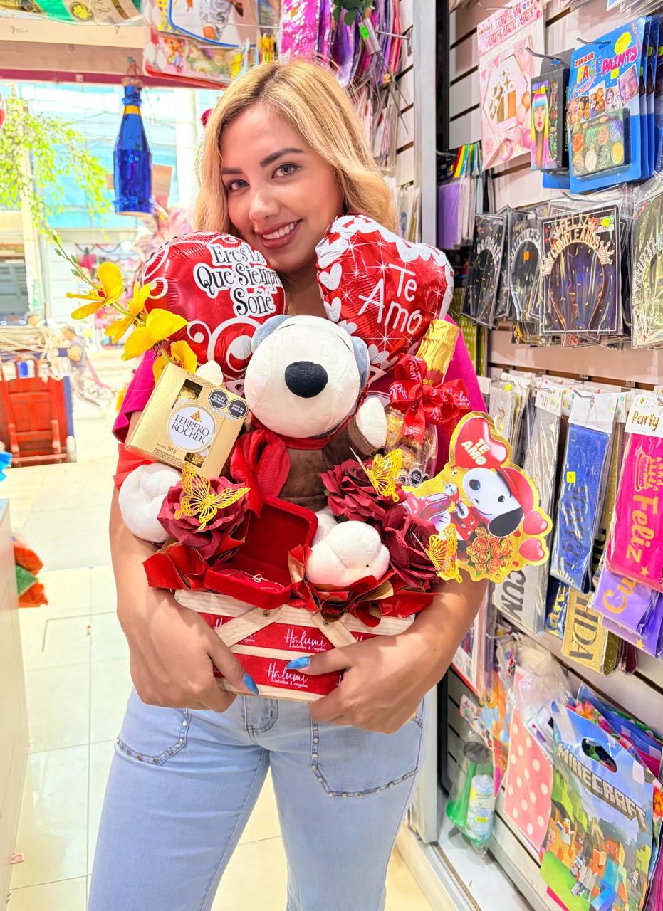 Flores artificiales + peluche + globos + 1 joya + chocolates