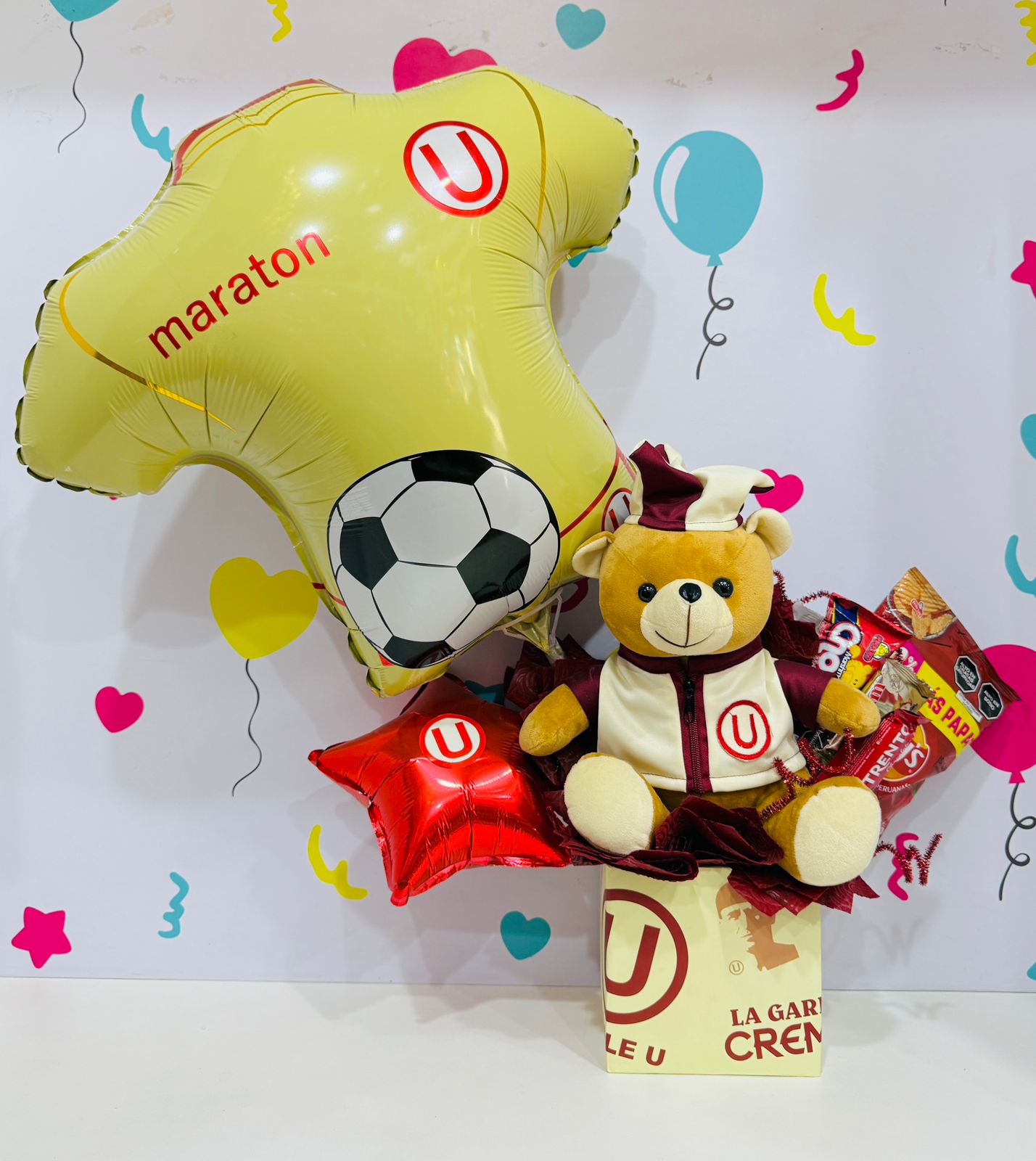 - 1 Globo camiseta - 1 Globo estrella - 1 Peluche - Dulces varios - Decoración del detalle - Base decorativa