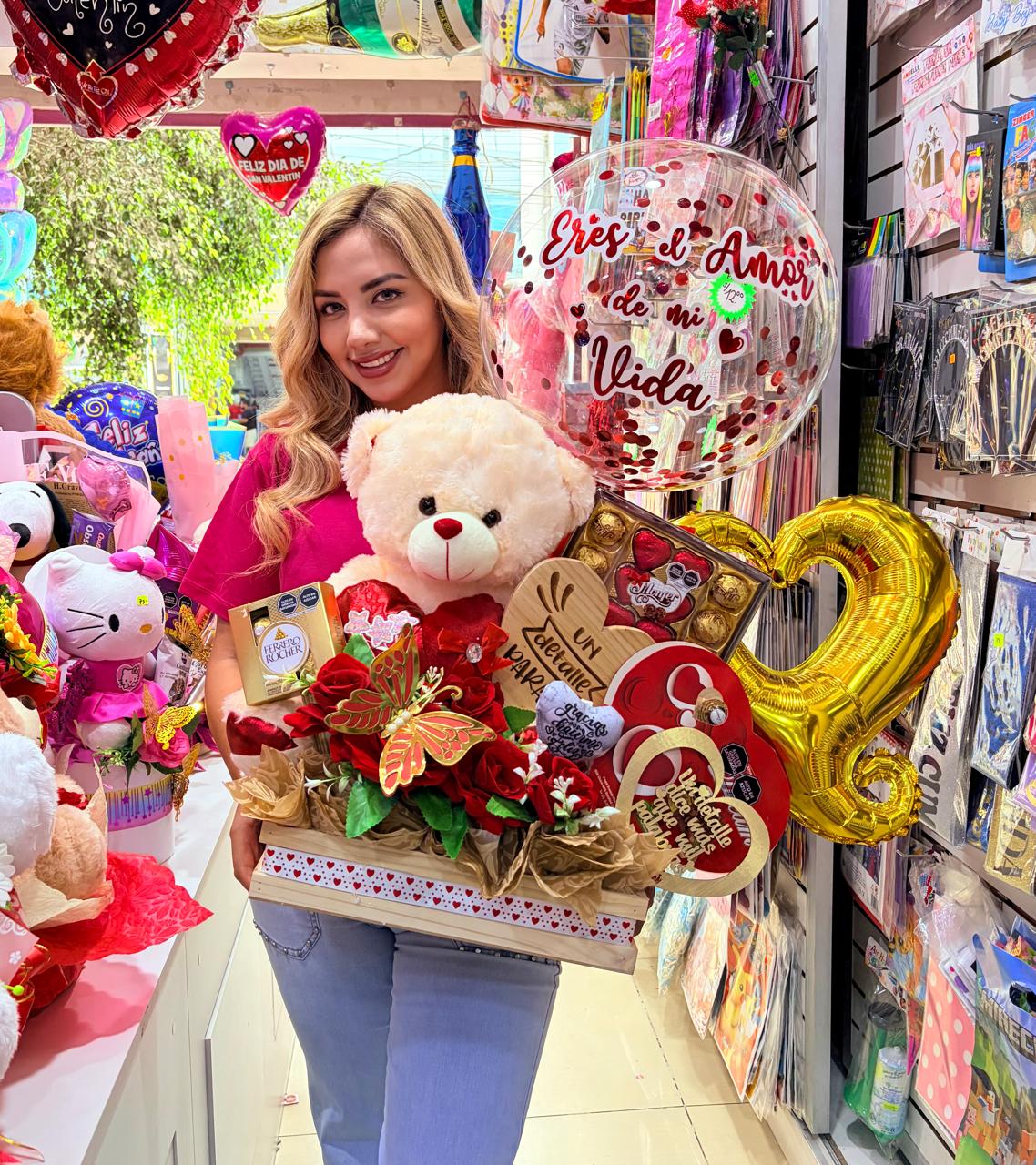 Flores artificiales + peluche + globos + cajas de chocolates