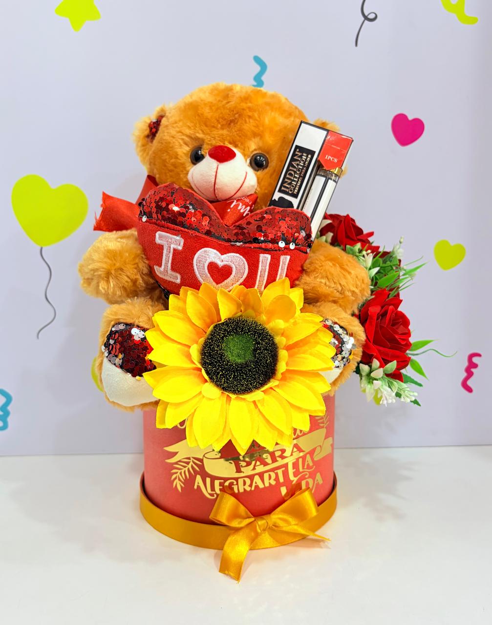 Flores artificiales + peluche + 1 perfume mini