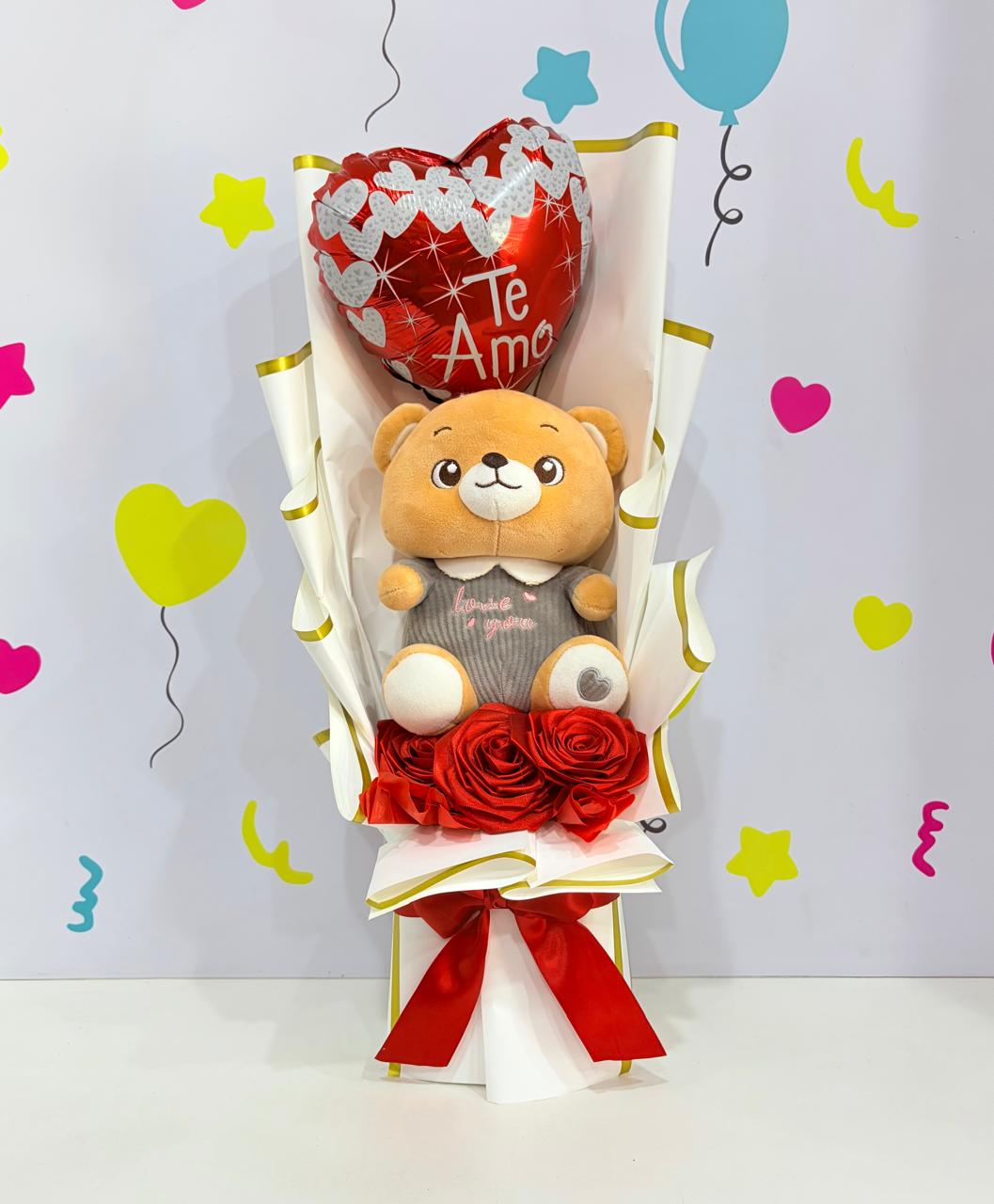 Flores artificiales + peluche + globo