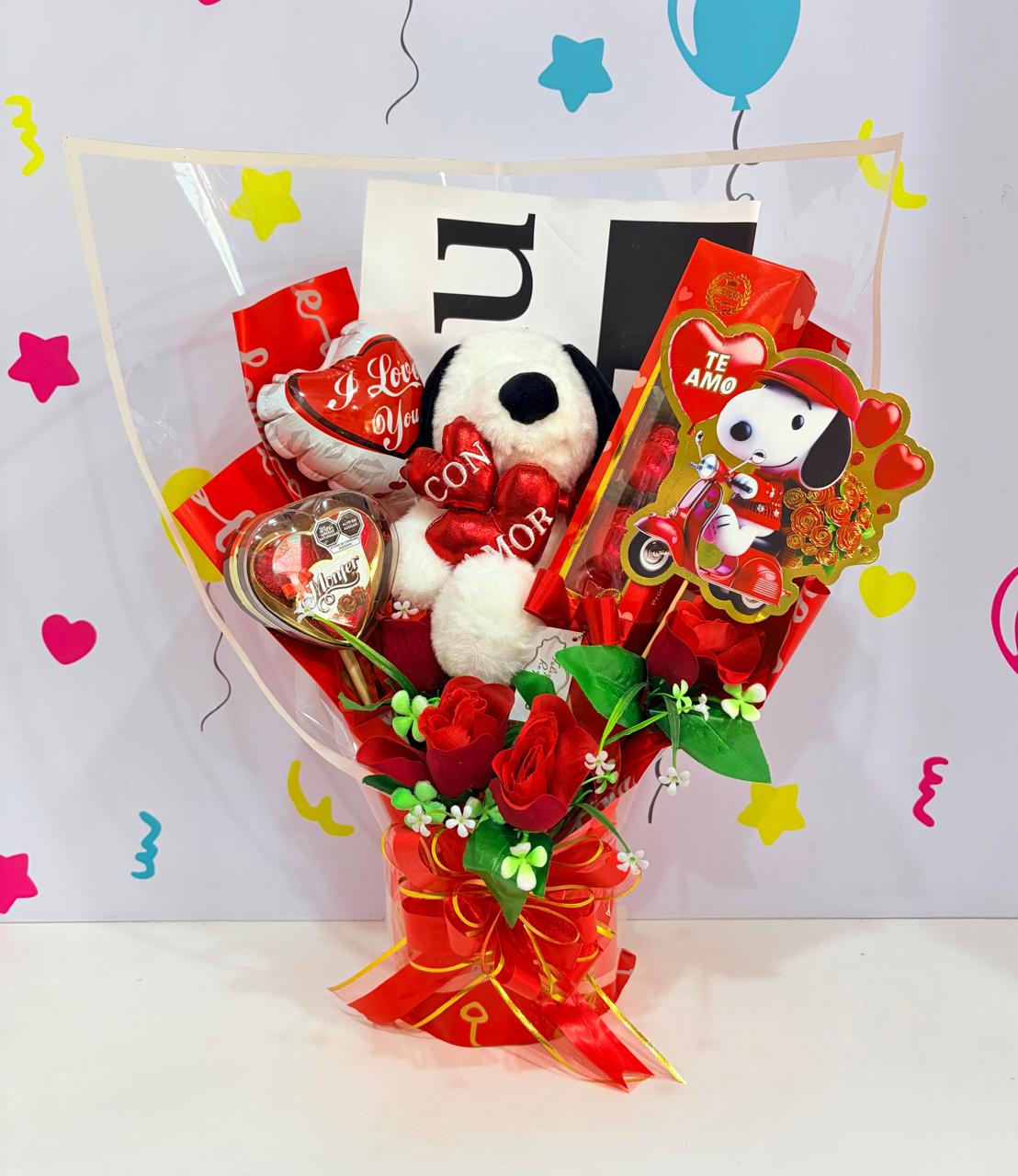 1 peluche + globito + rosas artificiales + chocolates